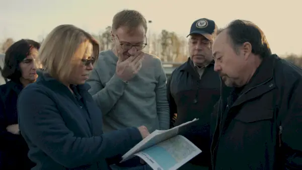 Stephen Pandos (centre) es reuneix amb els investigadors a 'Burden of Proof'.HBO