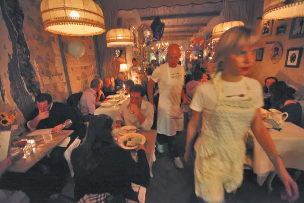 La senyora Natovich va assenyalar pots de vodka impregnats de remolatxa, rave picant, pinya i cogombre al llarg de la paret (venem 400 litres de vodka al mes, va dir); un obituari de Lenin en un dels diaris que hi ha darrere del paper de paret (no el podeu veure realment, però és allà dins); i els membres del personal de tamborets amb catifes llisquen al costat de les dones perquè hi reposin les seves bosses grans (com a dona, saps com odiem posar les nostres bosses a terra). Malgrat l'enrenou, no hi havia cap celebritat en evidència aquella nit, però al costat dels banys, la senyora Natovich va assenyalar notes gargoteades a la paret escrites per Mick Jagger, el patinador artístic Johnny Weir, el jugador d'hoquei Alexander Ovechkin i Bill Clinton, que va escriure: Gràcies. per la festa de la meva filla, donant les gràcies a Mari Vanna per acollir l'aniversari del Chelsea, signant el seu nom i la data, el 27 de febrer.